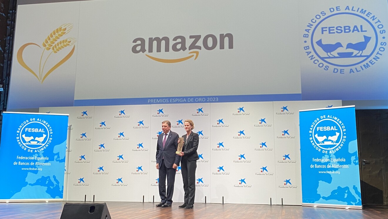 En 2023, FESBAL ha querido reconocer la labor solidaria de Amazon entregándole su máximo galardón: la Espiga de Oro. Un premio que cuenta con 20 años de historia, y que se otorga a las empresas que destacan más en su apoyo al trabajo de los bancos de alimentos.