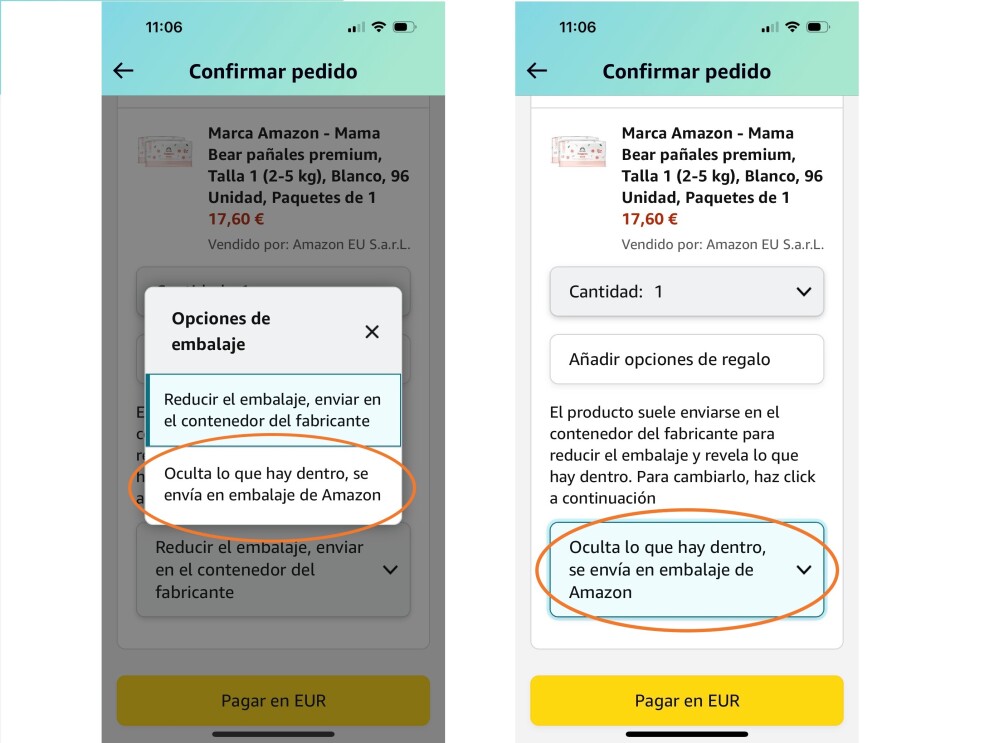 Los clientes que deseen ocultar el contenido de sus pedidos pueden usar un menú desplegable (disponible para muchos artículos certificados para envío sin embalaje adicional) y hacer clic en "Ocultar lo que hay dentro, enviar en embalaje de Amazon".
