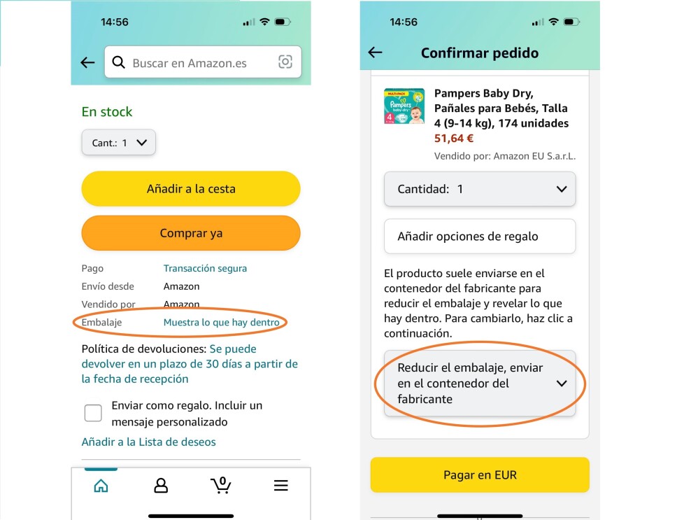 Amazon trabaja en estrecha colaboración con fabricantes como Procter & Gamble para diseñar y probar el embalaje de sus productos, incluyendo las marcas Pampers, Swiffer y Ariel, para que estos se puedan enviar sin necesidad de embalaje adicional. En aquellos casos en los que se necesita añadir embalaje, Amazon utiliza algoritmos de aprendizaje automático para tomar decisiones inteligentes de embalaje, de modo que este se ajuste bien, utilice la menor cantidad de material posible y proteja los pedidos de los clientes. Todas las bolsas de papel, sobres de cartón y cajas que utiliza Amazon en España son 100 % reciclables.